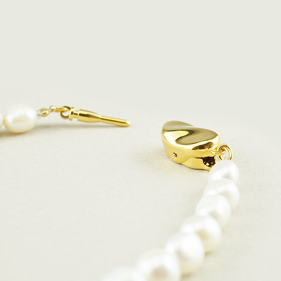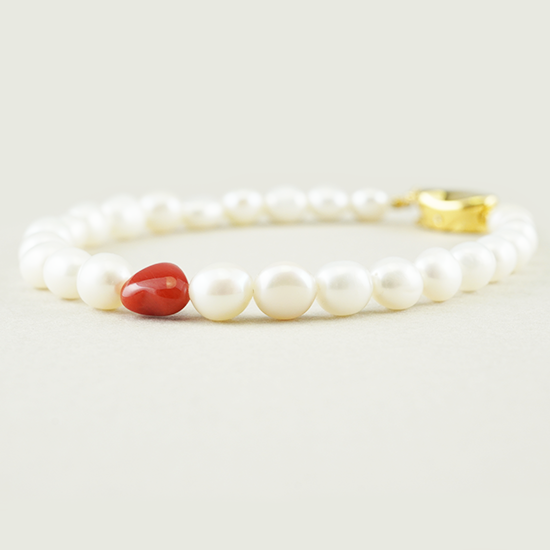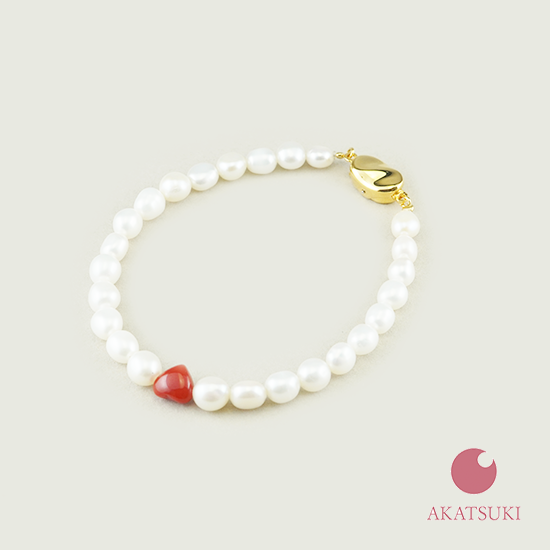 淡水パールの輝きと、地中海産赤珊瑚を使ったワンポイントのハートが素敵なブレスレットです。