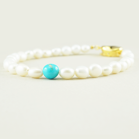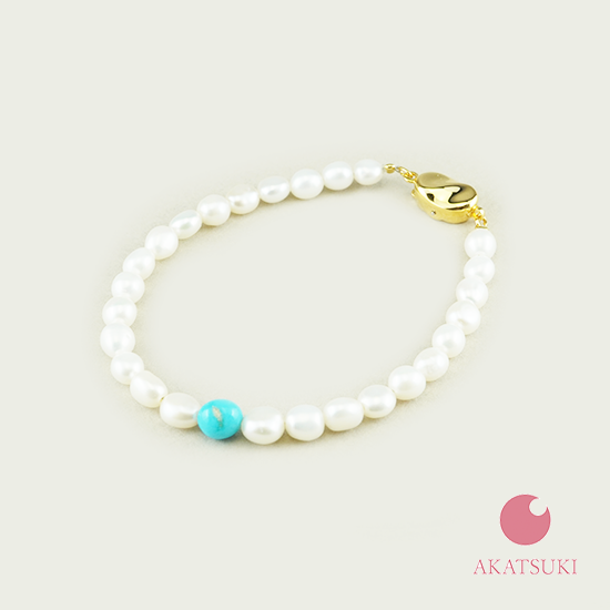 淡水パールの輝きと、ターコイズの鮮やかな青がワンポイントの、美しいブレスレットです。